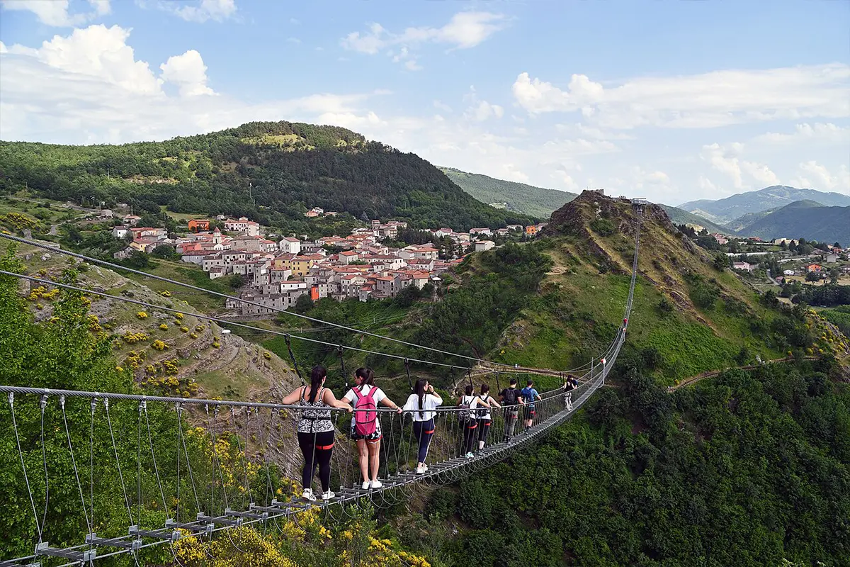 Tra boschi e alture dell’Appennino lucano, Sasso di Castalda è una meta ideale per chi ama cammini, natura e paesaggi sospesi. Il borgo è noto per i suoi ponti tibetani, che regalano un’esperienza immersiva tra vallate e panorami montani, oltre a sentieri e percorsi naturalistici adatti a chi cerca attività all’aria aperta e turismo slow.